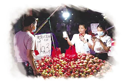 “妃子笑,试下试下。”来自湛江雷州24岁的陈雪珠与丈夫,人手一个单独水果摊位。老公负责卖西瓜葡萄,陈雪珠在自己的摊位上忙着给客人称荔枝。从工厂辞工后,陈雪珠就卖起水果,不过她平时都是流动叫卖多。“摆摊,看到哪里人多就去哪里。”前两周,城管和村里专门把她引导到这里的新地摊区域,固定了下来。“看大家一起摆摊,很开心。摊位固定了好很多,不用到处流动,安全很多。外面摆摊阻碍车道,自己也觉得危险。”陈雪珠一般下午四点多就出来摆水果摊位,直到晚上十一二点才回去。她说,摆地摊一天有200元收入。