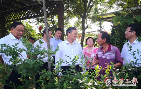 | 吕业升(右四)到头堡村蓝莓观光采摘园调研 |
