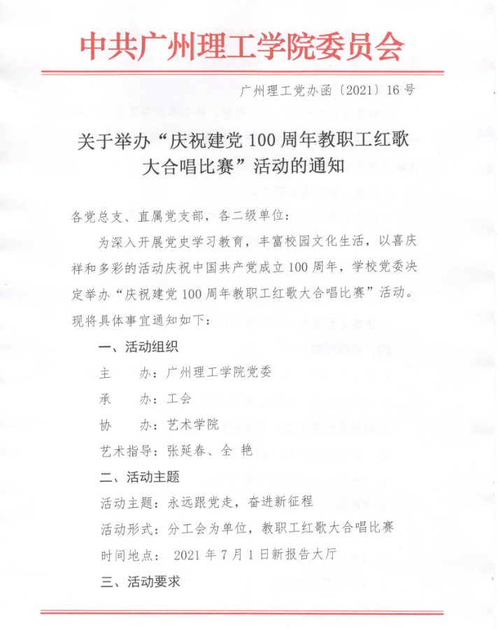 关于举办“庆祝建党100周年教职工红歌大合唱比赛”活动的通知