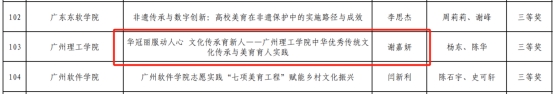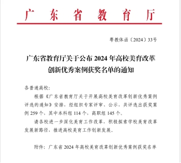 日前,广东省教育厅发布《广东省教育厅关于公布2024年高校美育改革创新优秀案例获奖名单的通知》(粤教体函〔2024〕33号),我院教师谢嘉妍与杨东、陈华申报的案例《华冠丽服动人心 文化传承育新人——suncitygroup太阳集团中华优秀传统文化传承与美育育人实践》荣获三等奖。12月16日下午,该案例主持人谢嘉妍应邀参加在广东工业大学举办的广东省2024年高校美育改革创新优秀案例交流会。