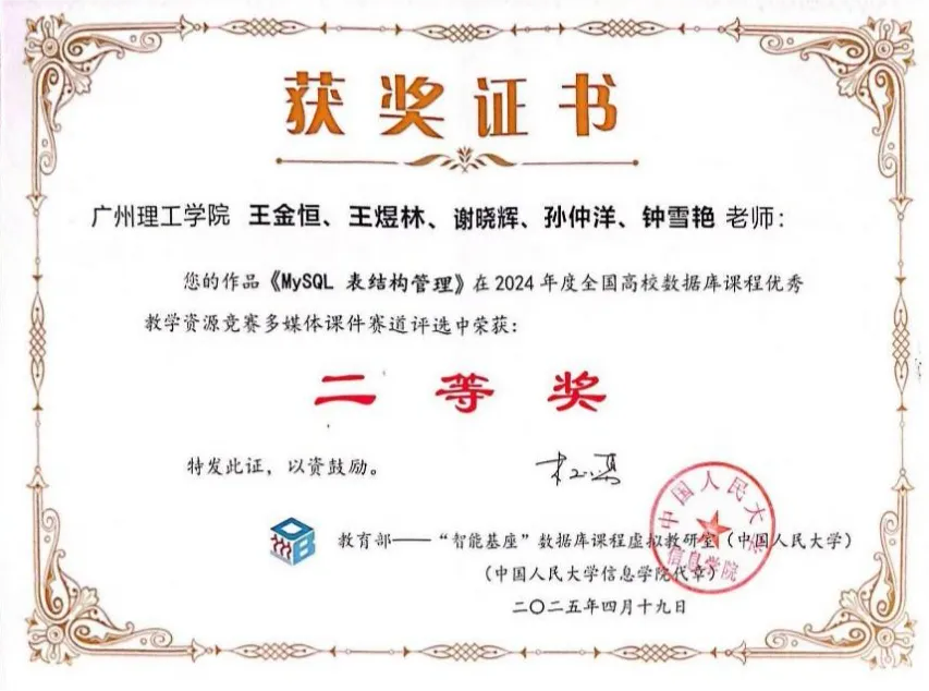 (通讯员:郑俊嫦)4月18日至4月20日,由山西农业大学软件学院、CCF太原承办的的教育部-华为“智能基座”数据库课程虚拟教研室2025年年会在山西农业大学举行,本届年会以“大模型智启数据库教学新范式”为主题,我校计算机科学与工程学院校级一流课程《数据库原理及应用》负责人王金恒老师应邀参加本次年会,由王金恒、王煜林、谢晓辉、孙仲洋、钟雪艳教师团队共同撰写的多媒体课件《MySQL表结构管理》荣获全国高校数据库课程优秀教学资源竞赛二等奖。