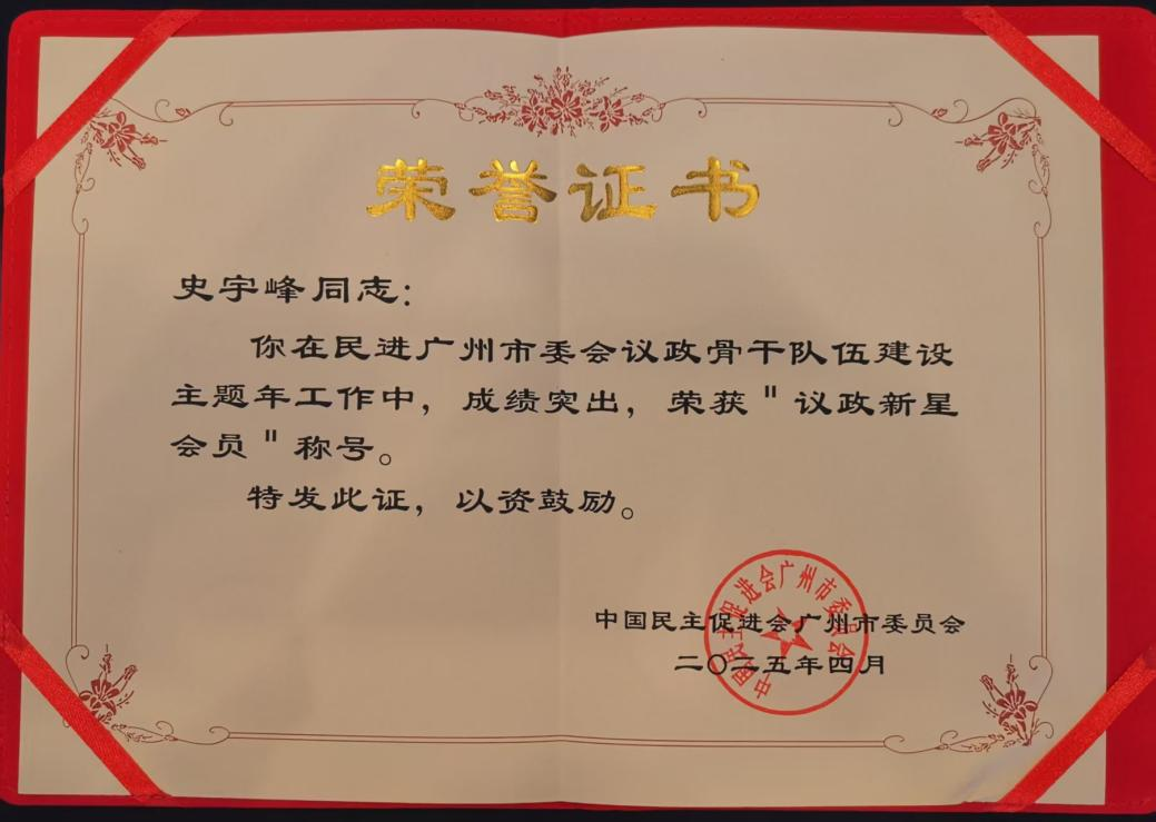 (通讯员:史宇峰)4月13日,民进广州市委员会召开“2025主题年”工作会议,会议表彰了议政先进集体和先进个人。我校经济管理学院史宇峰博士被评为议政先进个人,获得“议政新星会员”称号。