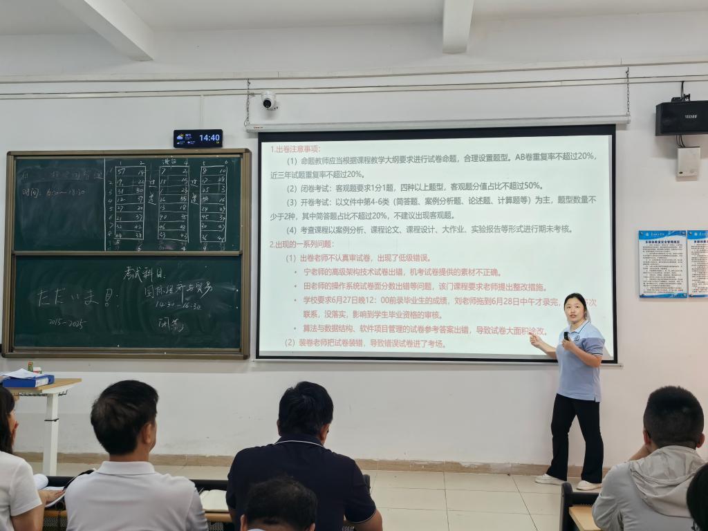 会议重点解读了新修订的《课程考核管理办法》,对期末试卷命题提出严格要求:AB卷重复率不超过20%,近三年试题重复率不超过20%;闭卷考试客观题分值占比不超过50%,题型不少于4种;开卷考试以简答题、案例分析题等为主,简答题占比不超过20%。针对往期出现的"参考答案错误""成绩录入延迟"等问题,会议提出6项改进措施,包括建立双人答案手写核验机制、实施机考模拟测试等。