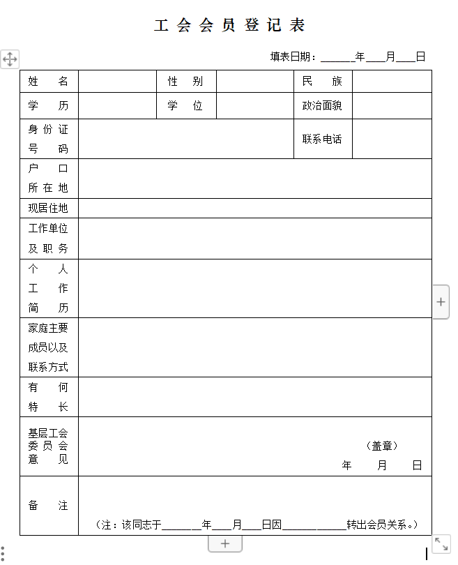 工会会员登记表