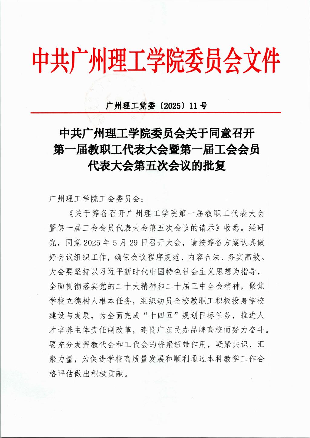 中共suncitygroup太阳集团委员会关于同意召开第一届教职工代表大会暨第一届工会会员代表大会第五次会议的批复